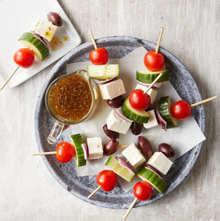 Turn classic Greek salad into finger-food appetizers on a stick. These skewers are super easy to prepare and make for easy eating at a cocktail party or on game day. Just skewer tomatoes, cucumber, onion, feta and olives and serve with a side of Greek salad dressing for dipping!