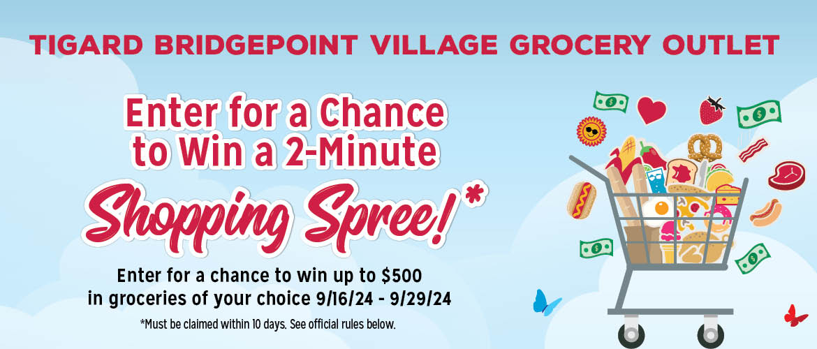 The Tigard Grocery Outlet “Win a 2-Minute Shopping Spree” Sweepstakes (“Sweepstakes”) is sponsored and administered by Grocery Outlet, 5650 Hollis Street, Emeryville, CA 94608 (“Sponsor”).