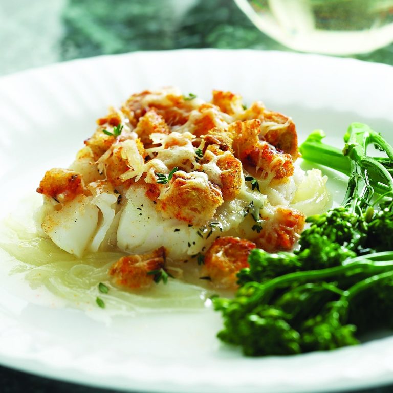 Dry white wine and Gruyère cheese give this fish casserole a rich flavor that hides its virtue. Before baking, we top the dish with seasoned whole-wheat breadcrumbs, which add a wholesome, nutty flavor and dietary fiber. For variety, you can substitute almost any mild white fish.