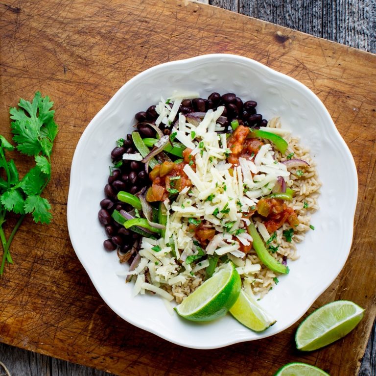 Simple brown rice and black beans serve as the backdrop for sautéed veggies and taco toppings.
