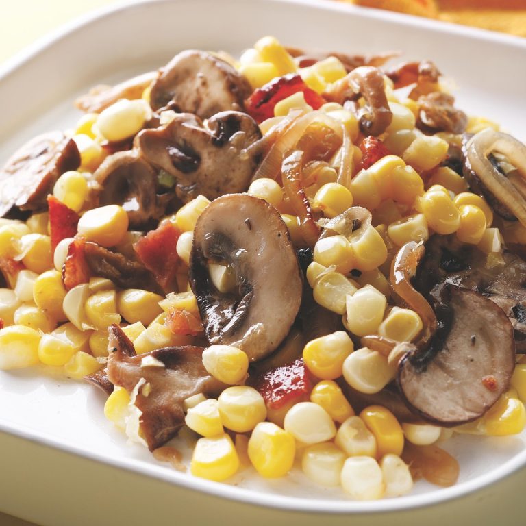 This simple combination of corn, mushrooms and bacon goes with everything from burgers to lightly scrambled eggs and toast.