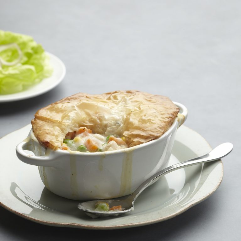 An irresistible crisp (but easy) phyllo crust tops these homey individual chicken potpies. Make a double batch and freeze extras to have on hand anytime. Serve with a butterhead lettuce salad with red onion and white-wine vinaigrette.