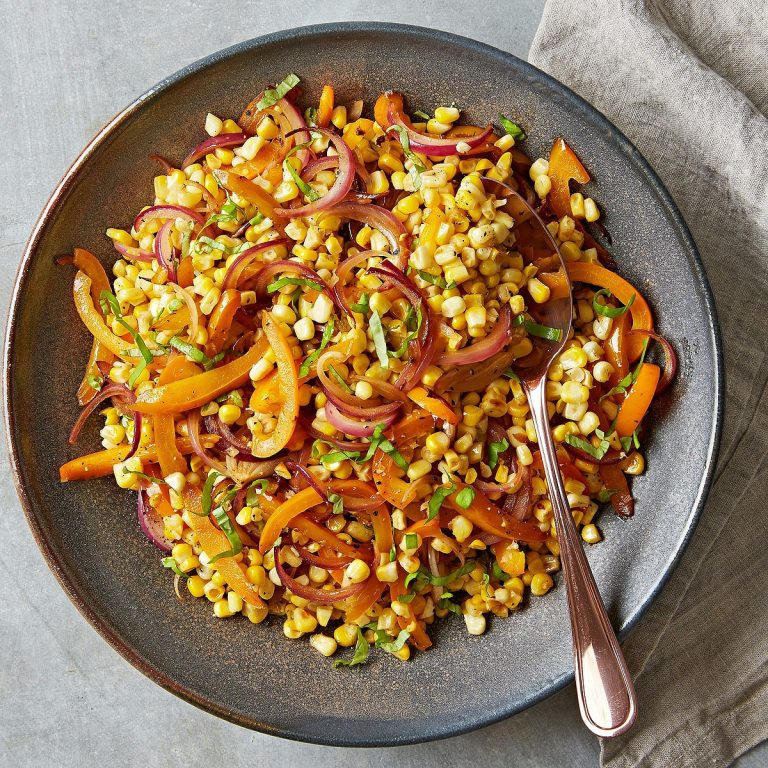 - Heat oil in a 10-inch skillet over medium heat. Add the corn, bell pepper and onion. Cook, stirring, until the bell pepper and onion are tender-crisp, about 5 minutes. Season with salt and pepper.