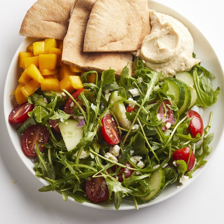 - Toss arugula in a bowl with tomatoes, cucumber, onion, oil, vinegar and pepper. Top with feta. Serve with pita and hummus.