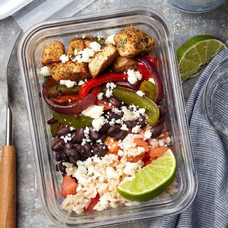 - To assemble: Divide equal portions of black beans, the chicken mixture, bell pepper mixture and rice mixture among 4 microwave-safe containers. Top each with queso fresco and a lime wedge. Refrigerate until ready to use (up to 4 days).