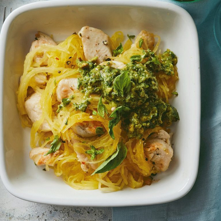 Give pesto pasta a healthy makeover with this easy recipe that combines low-carb spaghetti squash with high-protein chicken breast. Top this powerhouse combo with homemade basil pesto that gets a creamy upgrade from ripe avocados to complete a mouthwatering chicken dinner.