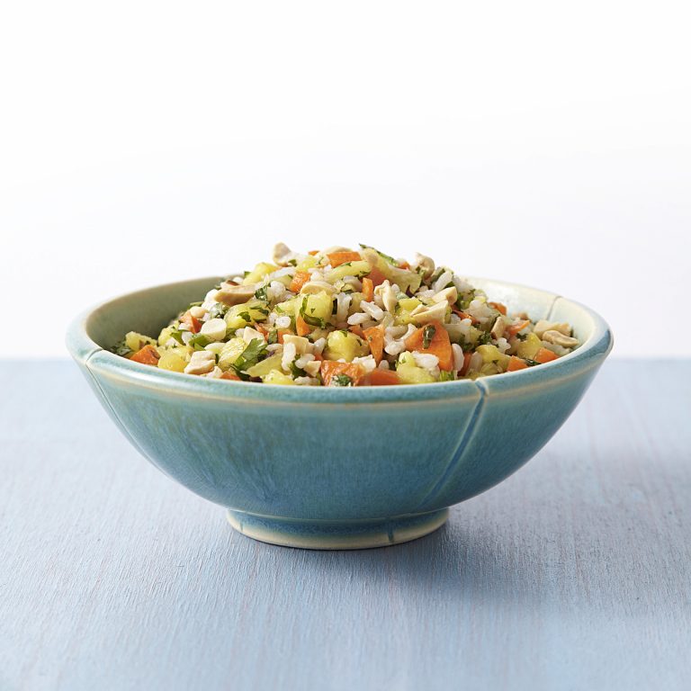 - Stir the rice, pineapple, carrot, herbs and scallions into the dressing. Sprinkle with peanuts.