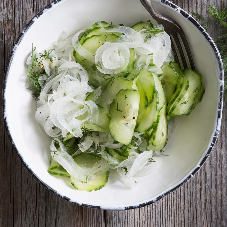 For this old-fashioned Southern cucumber salad recipe, thin slices of cucumber and onion marinate just long enough to develop a touch of tanginess without any sharp bite. Serve with sweet dishes like barbecue to lend a refreshing balance.